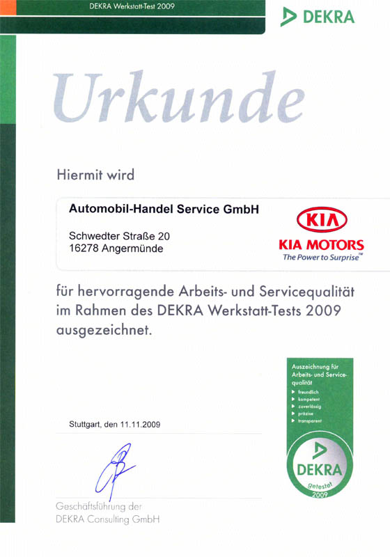 Schwarz auf weiß können wir jetzt belegen, die Fahrzeuge unserer Kunden sind bei uns in besten Händen. Im Werkstatt-Test der DEKRA 2009 schnitten wir mit „Auszeichnung“ ab.